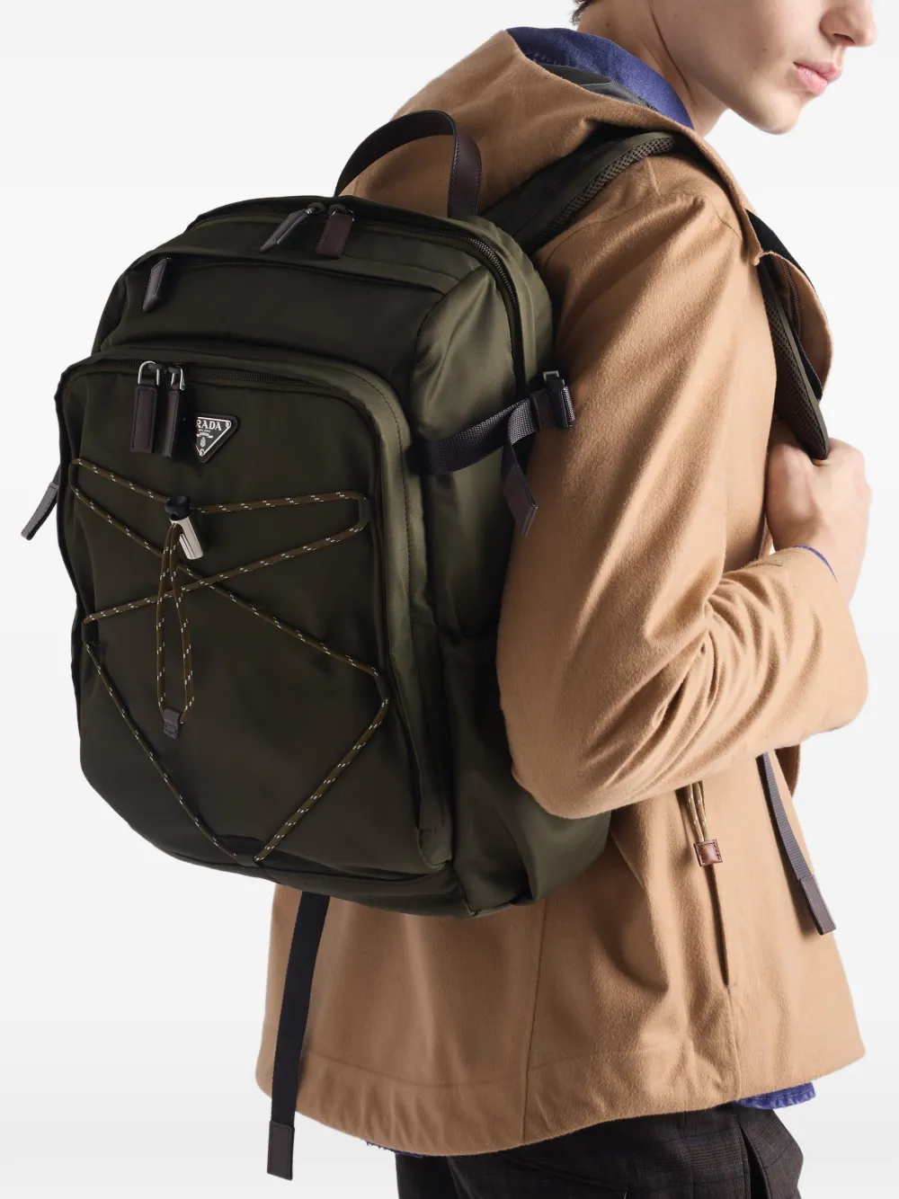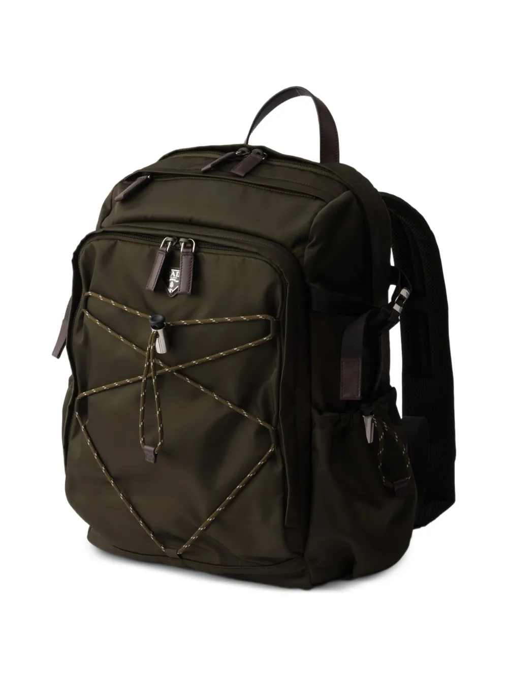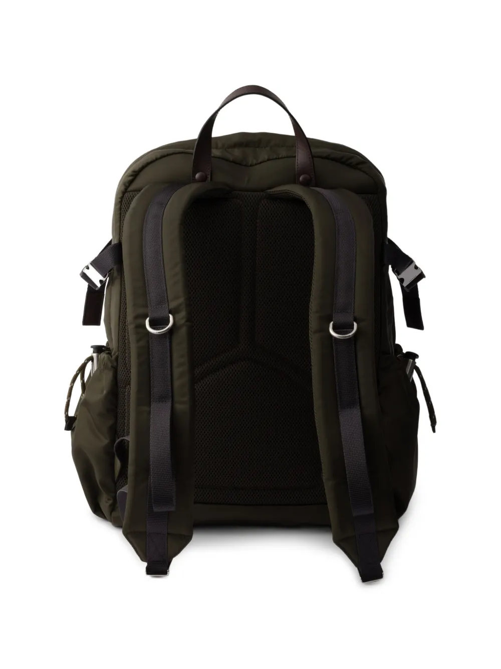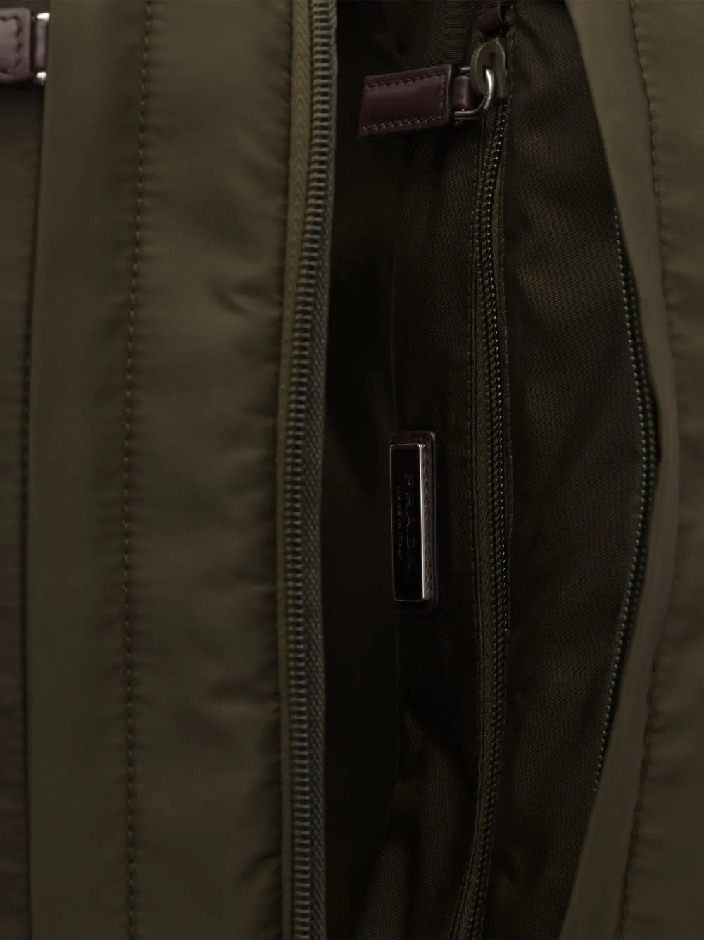 Highlights army green leather trims several pockets enamel triangle logo top handle zip fastening FARFETCH ID: 33125040 Brand style ID: 2VZ122VOOO2DMG Composition Outer: Calf Leather 100%, Recycled Polyamide 100%