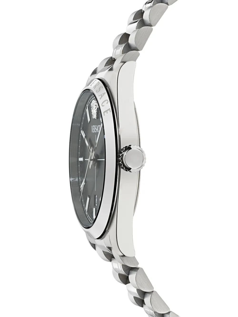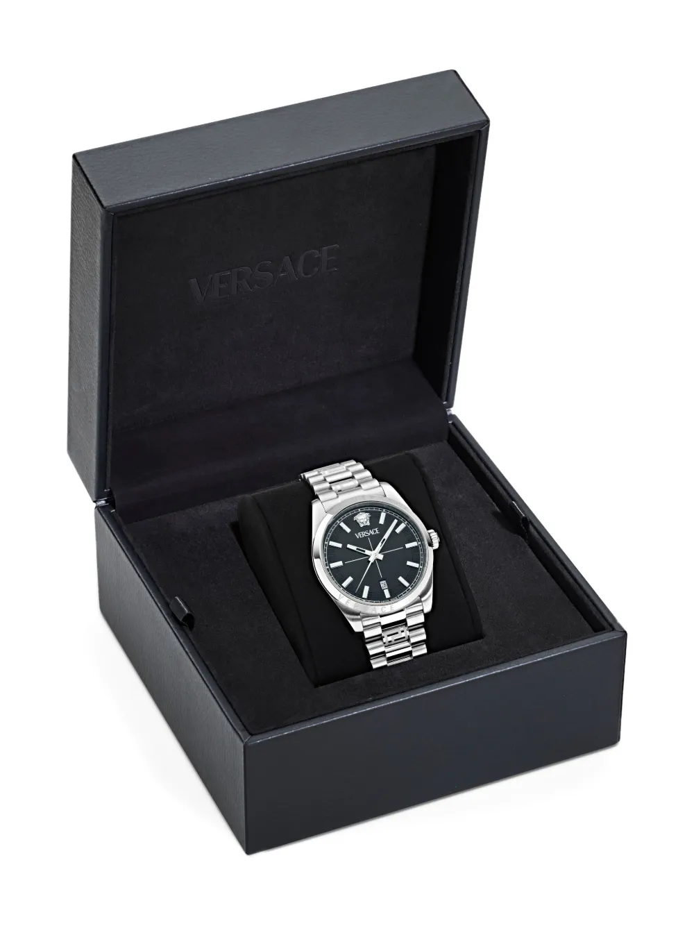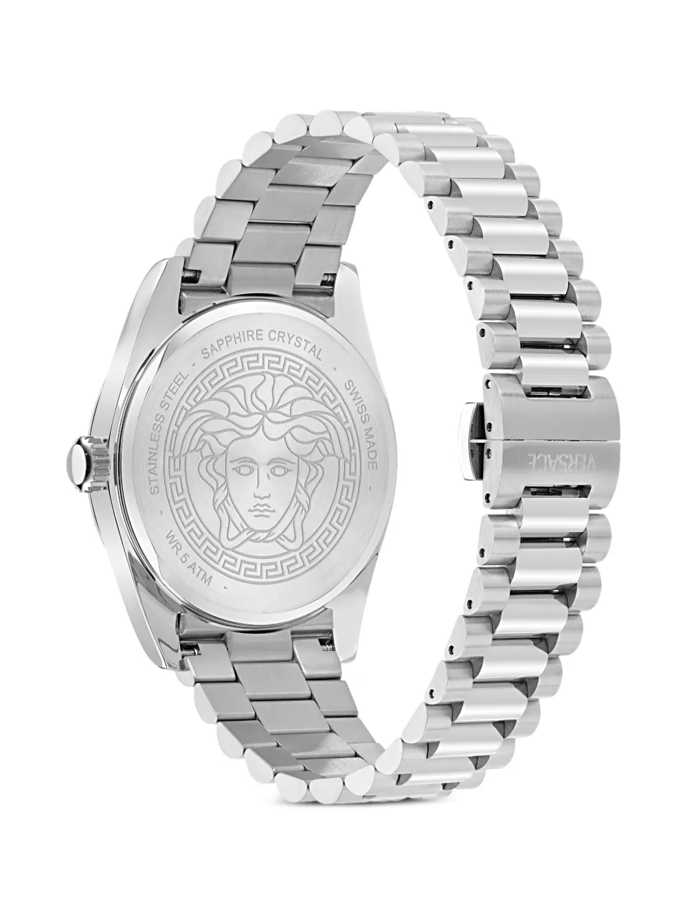 Highlights silver-tone round case 40 mm black dia Medusa Head and index markers plain bezel quartz movement push-pull crown engraved logo This item comes with a standard one-year warranty from the boutique. Imported FARFETCH ID: 31943497 Brand style ID: VE0G00725 Composition Sapphire Crystal 100%, stainless steel 100%